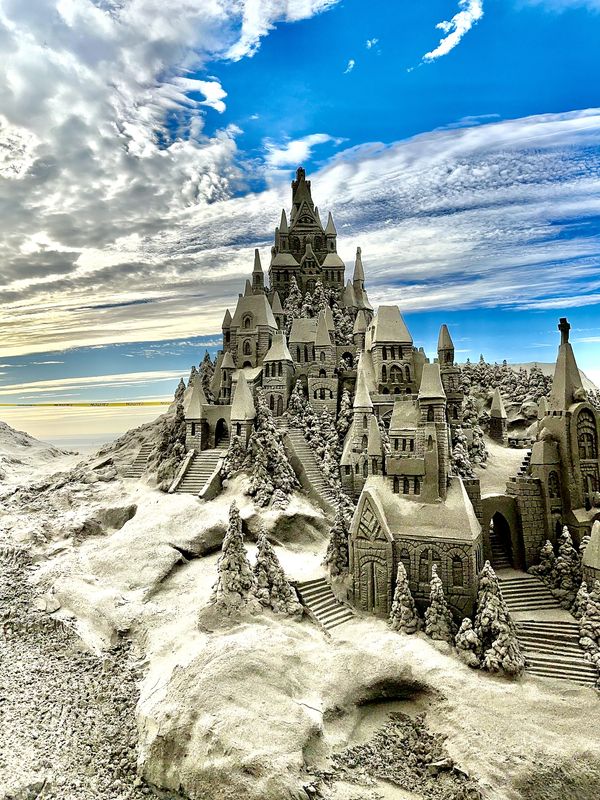 Working under his brand SandcastlesInParadise.com, Scotty specializes in massive, highly detailed creations inspired by medieval architecture, old-world European design, and fantasy storytelling. His signature style blends classic castle structures with flowing organic textures, often turning a simple pile of sand into entire “cities in the sand.”